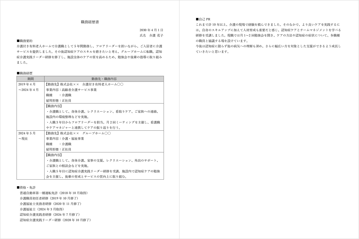 介護職の場合、介護業界での経験が長く「介護士→介護福祉士→ケアマネジャー」のようにステップアップしてきた方は、職種ごとにまとめられるキャリア式がおすすめです。